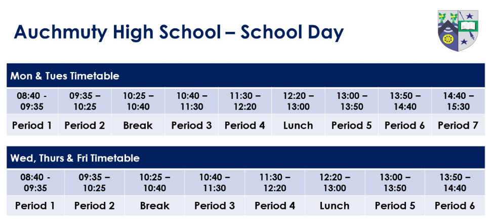 Monday and Tuesday have 7 periods = 8:40 – 15:30