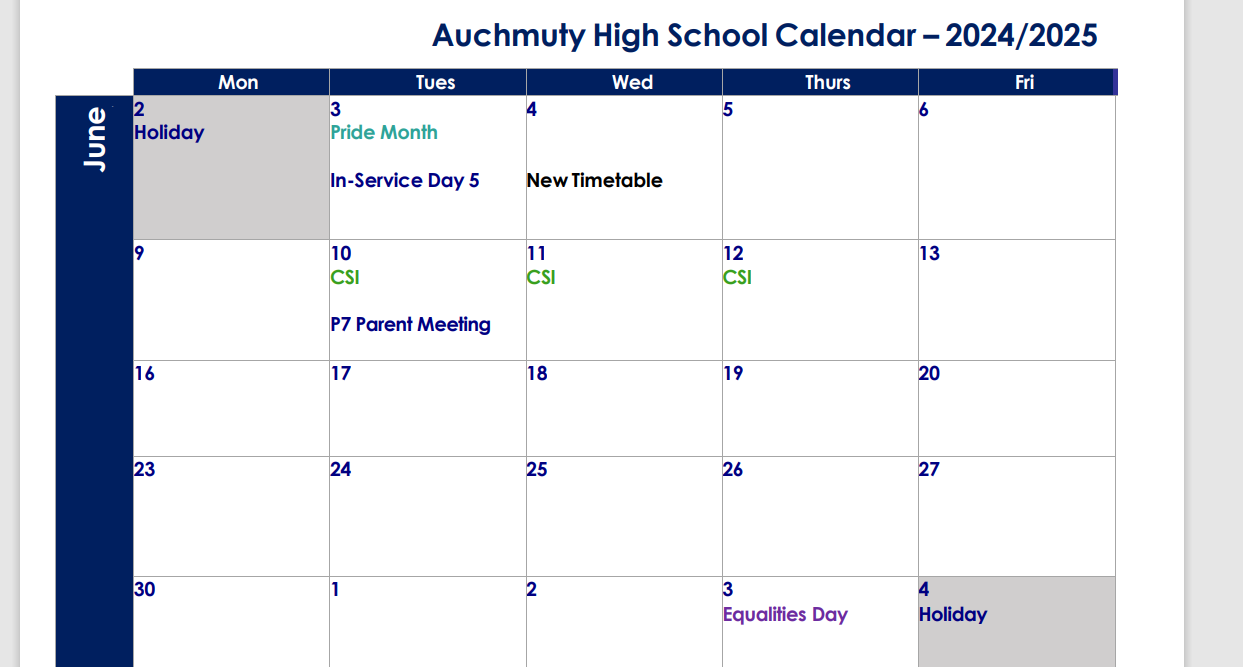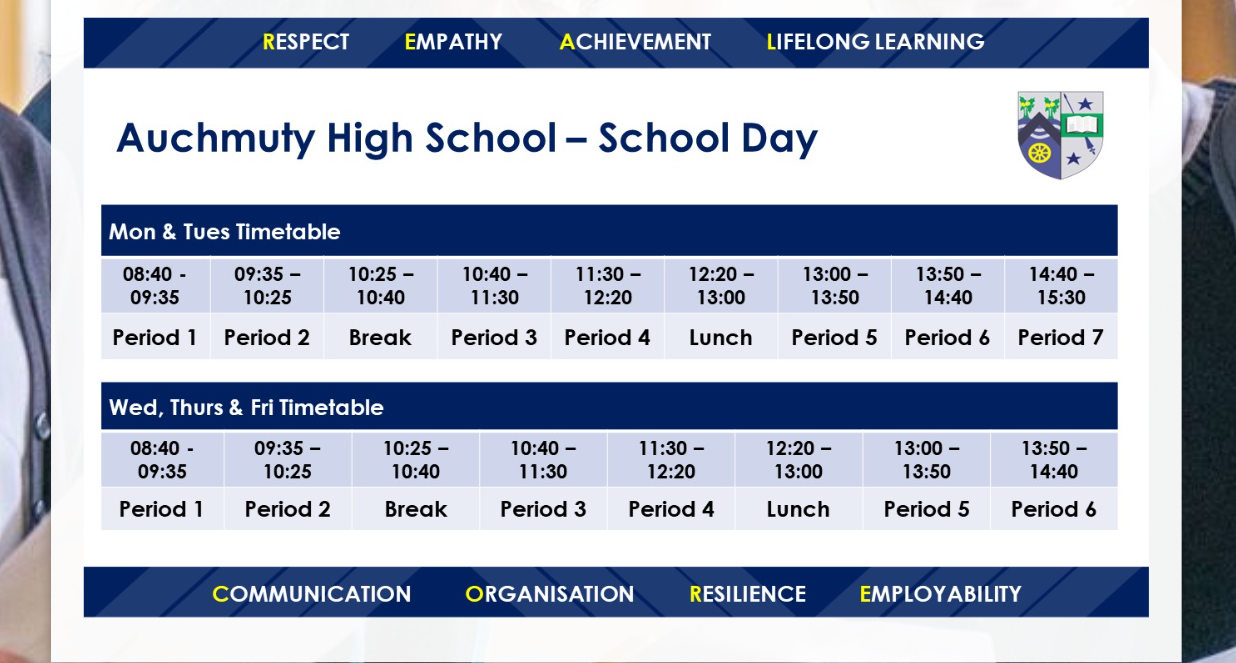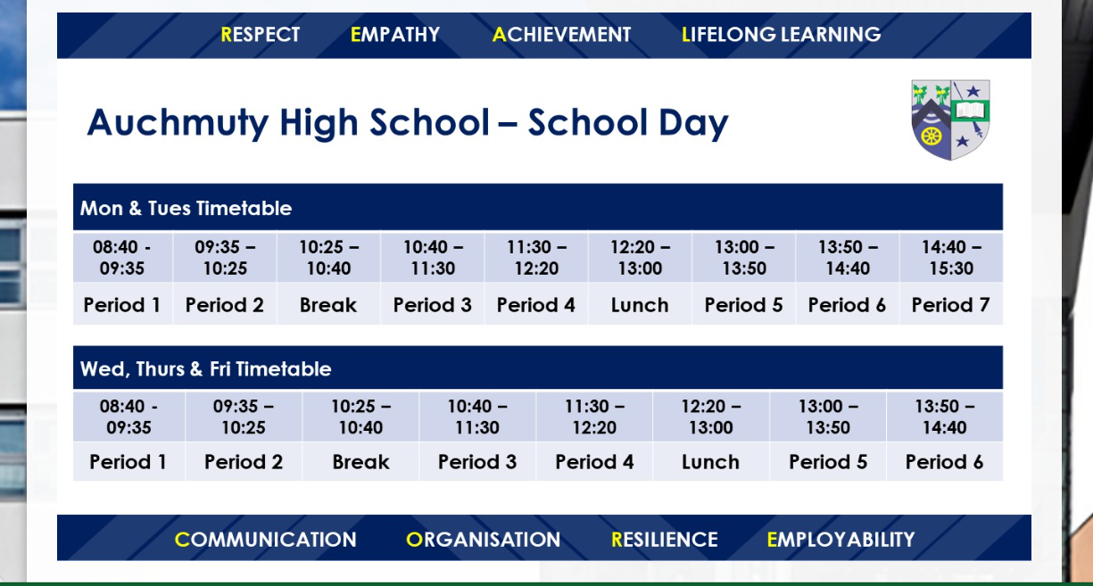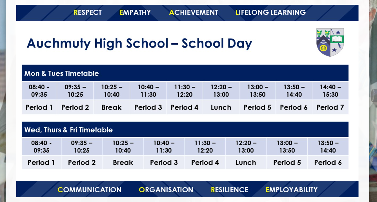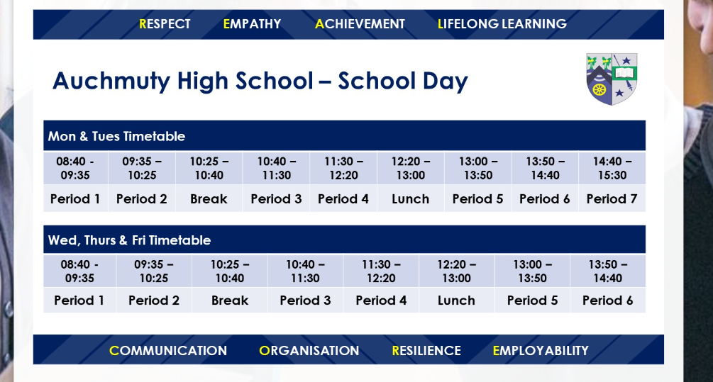 The pupil week is broken into a 32 period timetable – each period lasting 50 minutes.